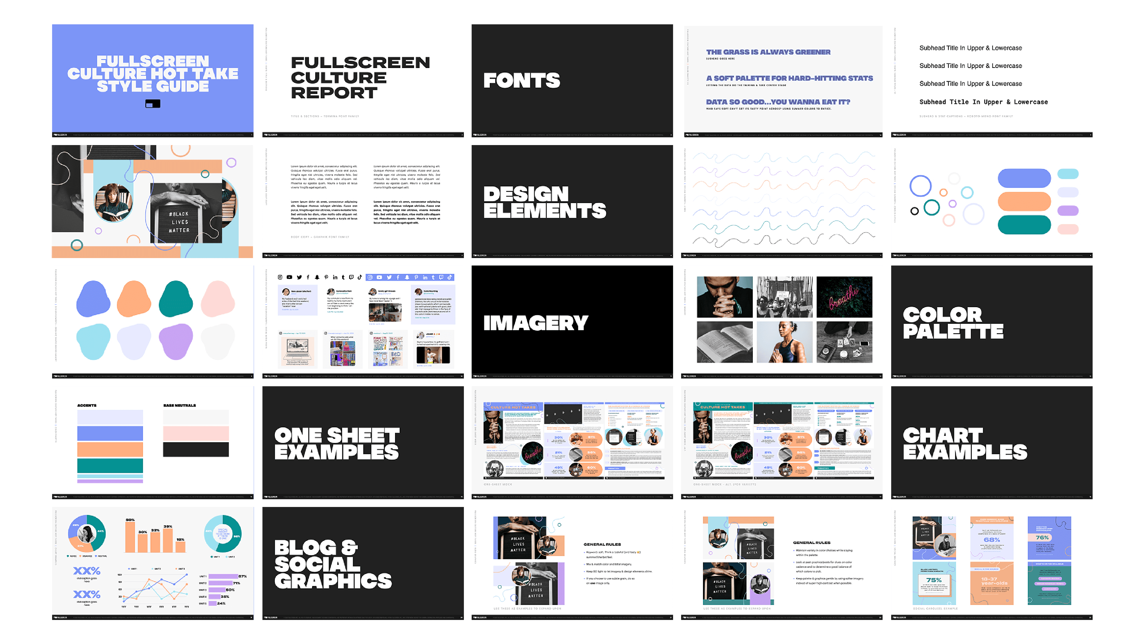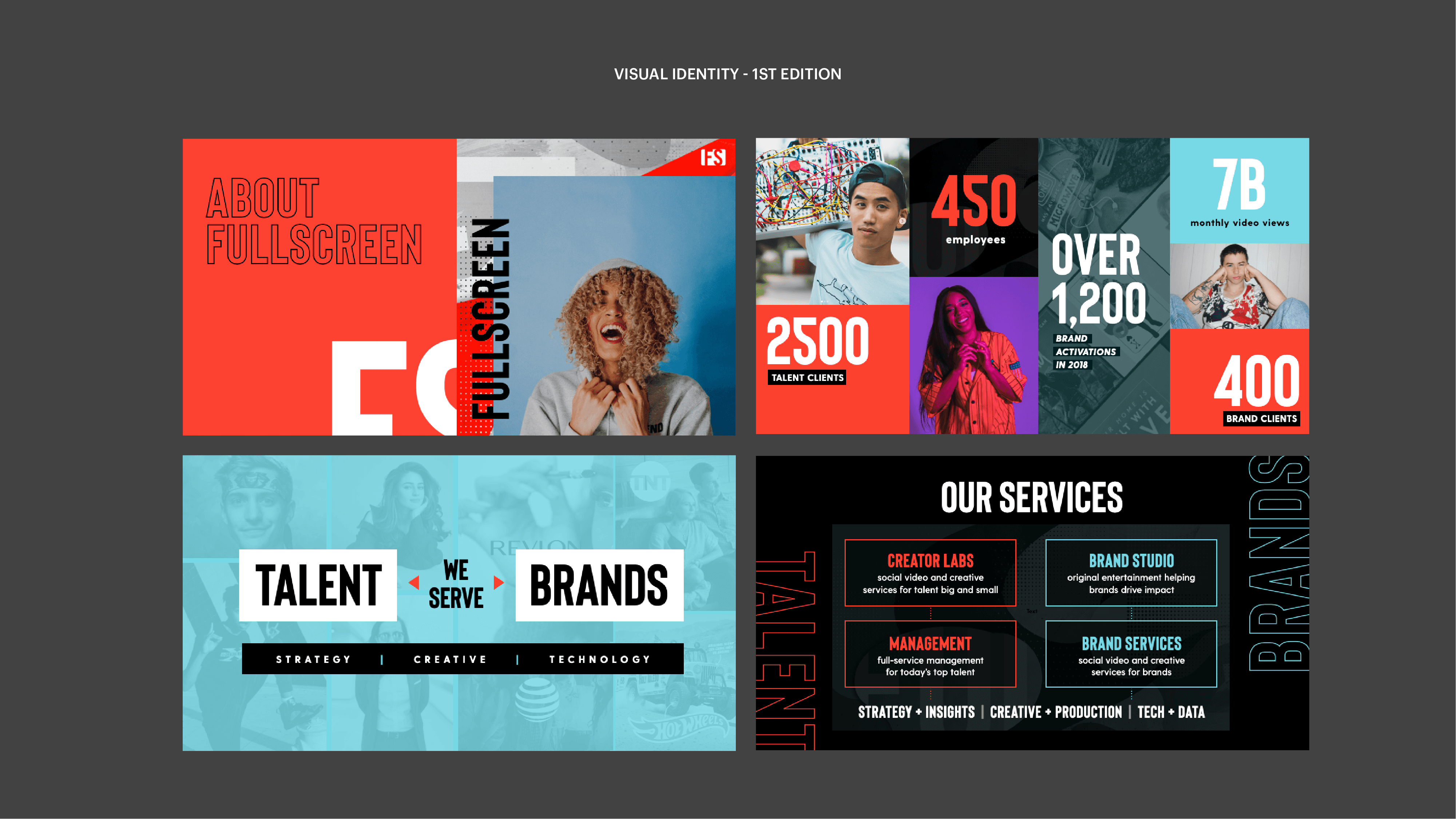 ✨ Fullscreen — Re-brand OVERVIEW A bold reimagining of Fullscreen’s visual identity—focused on building a more expressive, flexible system that reflects the brand’s creative culture and creator-led ecosystem. THE APPROACH We explored an open, adaptable identity system that moves beyond rigid brand constraints in favor of expressive visuals, confident typography, and culturally resonant design. The direction was intentionally dynamic, enabling the brand to evolve fluidly across creators, platforms, and formats. THE SOLUTION A refreshed visual identity grounded in clarity, confidence, and cultural relevance—designed to feel energetic, modern, and deeply connected to the creator community. SCOPE • Native visual identity development • Visual language and style exploration • Refined identity system and brand applications • Social and digital visual frameworks • Rebranded cultural report and style guide