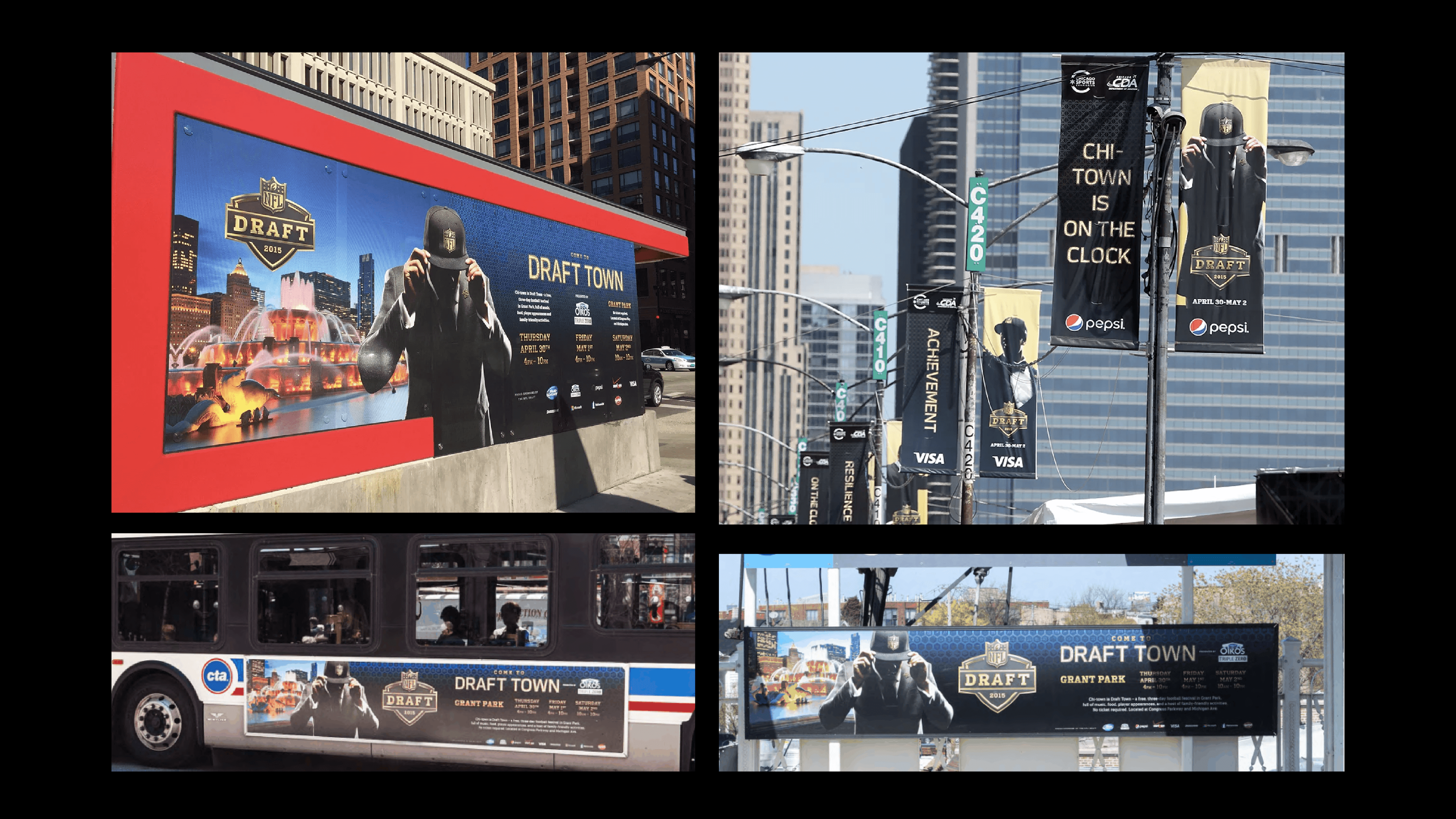 ✨ NFL Draft 2015 — Creative OVERVIEW In 2015, the NFL Draft returned to Chicago in celebration of its 50th anniversary—marking a historic moment for the league and the city. The project focused on establishing a comprehensive visual style guide to support branding across venues, fan experiences, and broadcast environments. THE CHALLENGE The event required a cohesive identity capable of scaling across architectural environments, live fan activations, promotional materials, and digital media—while honoring the legacy and significance of the milestone year. THE APPROACH We developed a unified visual system designed to translate seamlessly between physical space, print collateral, motion, and on-screen experiences. The direction balanced heritage and modern energy, ensuring the Draft felt both celebratory and forward-looking. THE OUTCOME A comprehensive event identity and style guide enabling consistent storytelling across the Auditorium Theatre at Roosevelt University, Grant Park fan experience, promotional campaigns, collateral, and digital/video components. SCOPE • Event visual identity and style guide • Environmental and venue branding • Promotional and print collateral • Digital and motion graphics assets