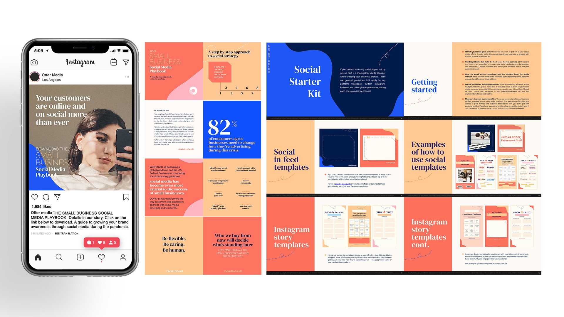 ✨ Otter Media Small Business Playbook & Cultural Report OVERVIEW We developed a comprehensive social media playbook to support small businesses navigating the challenges of COVID-19. The initiative provided a complete guide and template toolkit designed to help brands maintain visibility, communicate effectively, and grow their audiences during a period of global disruption. Alongside the playbook, we created a visual editorial guide exploring how lifestyle and culture evolved in the post-pandemic landscape—translating research and insight into a bold, illustration-driven storytelling system focused on clarity, accessibility, and impact. THE APPROACH The work combined research, editorial strategy, and visual design to distill complex cultural shifts into actionable guidance for small businesses. An expressive illustration system and structured editorial framework ensured the content remained engaging, easy to navigate, and widely adaptable across digital channels. THE SOLUTION A unified editorial and visual toolkit empowering small businesses with practical communication resources—while capturing the broader cultural transformation shaped by the pandemic. SCOPE • Editorial design and information architecture • Cutomizable digital and social media asset toolkit